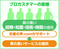 つまり、お客の声.comは、一人一人のプロカスタマーが、自分の出来ることに対して、少しだけ手を貸すことで成り立つものです。各自が責任を持って、プロフェッショナルな対応をとることで、質の高い内容を提供することができます。
